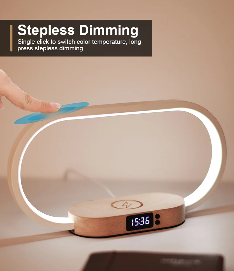 The design of this wireless charging table lamp is perfect for the modern home.The LED light is soft and the brightness is adjusted by just touching the top of the led with three colors of light. Moreover, its wireless charging function is extremely convenient, just place your phone on the base and it will start charging. The clock function is also very useful, the digital display is clear and you can know the time at a glance. Overall, very happy with this product, it simplifies my workspace while adding a modern touch to the interior.